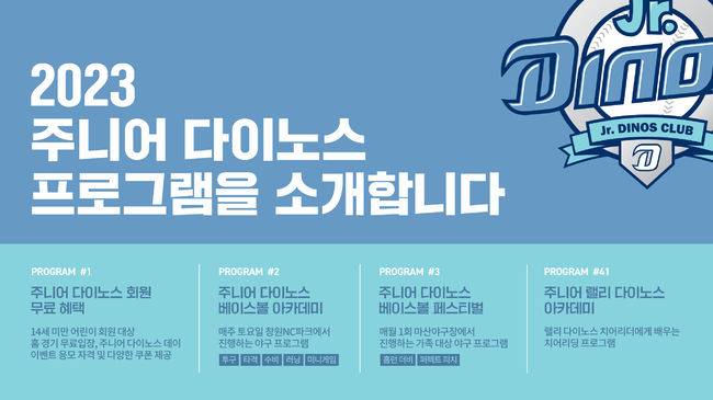 [OSEN=손찬익 기자] NC 다이노스가 2023시즌을 맞아 새롭고 풍성해진 어린이 회원 ‘주니어 다이노스’를 모집한다.
