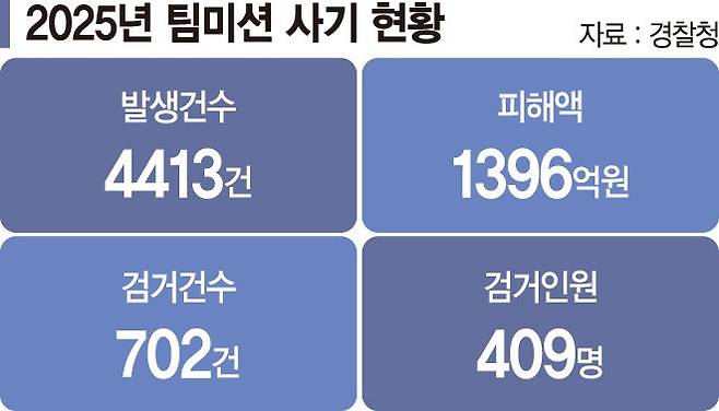 이같은 수법은 최근 SNS를 통해 확산하고 있다. 경찰청에 따르면 지난해 팀미션 사기 발생 건수는 4400여건으로, 피해액은 1300억원을 넘었다. 역할이 분담된 조직 범죄인 경우가 적지 않다는 게 수사 당국의 설명이다. 한 경찰 관계자는 "팀미션 사기는 보이스피싱에서 파생된 신종 피싱 유형"이라며 "최근 신고가 다수 접수되면서 중점 단속 대상으로 보고 있다"고 설명했다. 이어 "젊은 층을 겨냥한 알바·부업 형태의 사기가 체감상 늘고 있다"며 "해외 거점을 둔 조직이 시나리오를 바꿔가며 여러 계층을 대상으로 범행하는 경우가 많아 수사가 쉽지 않은 측면이 있다"고 덧붙였다.