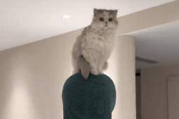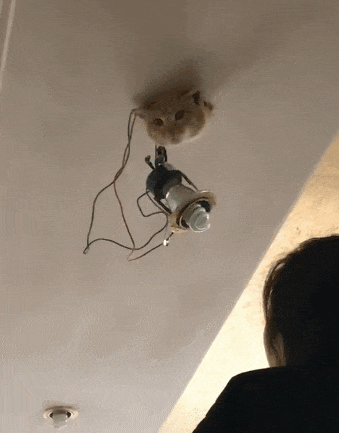 한 고양이는 천정 속까지 들어가 등기구 설치 구멍으로 얼굴을 내밀고 있네요. 대단합니다!