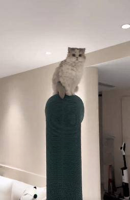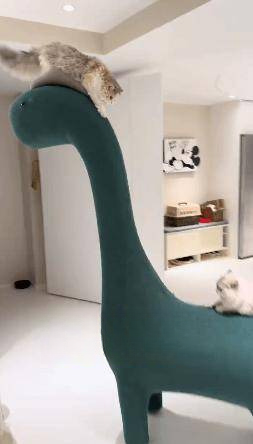 한 여성은 집에 있는 고양이를 위해서 2미터 높이의 공룡 캣타워를 구입했습니다.