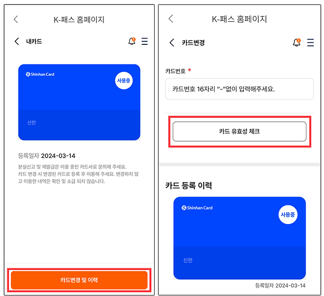 이에 K-패스 카드를 등록했다면 '카드변경 및 이력' 메뉴가 보일 텐데 가볍게 클릭해보자. 카드번호란에 모바일 티머니에서 등록했던 카드 번호를 입력하고 '카드 유효성 체크' 버튼을 누른 후 확인 버튼을 클릭하면 모든 절차가 끝난다.