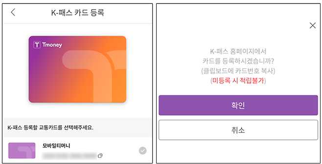 K-패스 탭 메뉴 중 카드 관리 항목에서 기존에 발급한 모바일 티머니 카드를 K-패스로 연동할 수 있다.