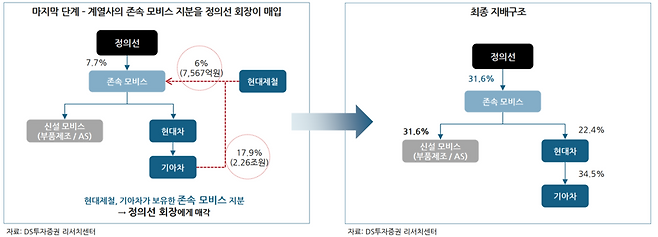 정 회장은 계열사 지분 매각을 통해 지분 매입에 필요한 유동성을 확보할 수 있을 것으로 보인다. 이외에 보스턴다이나믹스가 상장할 경우 수조원대의 유동성이 추가되는 만큼 지배구조 재편에 필요한 현금을 확보한 것으로 관측된다. 이 시나리오가 성공한다면 정 회장→현대모비스→현대차→기아로 이어지는 지배구조가 완성된다.