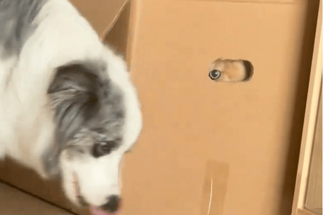 고양이는 재빨리 몸을 돌려 상자 안으로 뛰어들었습니다. 상자는 위쪽에 적당한 크기의 구멍이 뚫려 있어 더욱 특별한 피난처였습니다. 고양이는 강아지를 쉽게 용서할 생각이 없어 보였습니다. 구멍 밖으로 고개를 내밀고 마치 경계하는 작은 정찰병처럼 강아지를 뚫어져라 바라보았습니다.