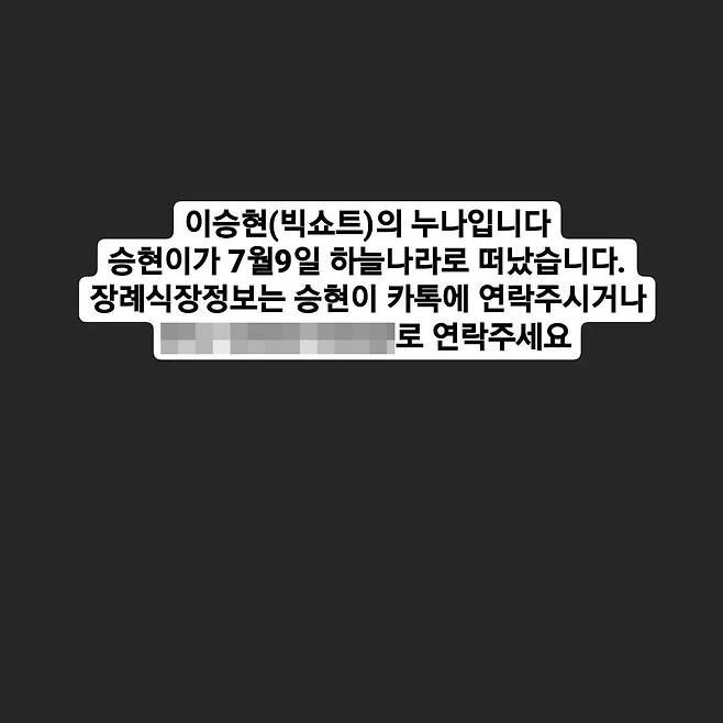 11일 오후 빅쇼트의 인스타그램에는 "이승현(빅쇼트)의 누나입니다. 승현이가 7월 9일 하늘나라로 갔습니다"라는 글이 담긴 사진이 게재됐다.
