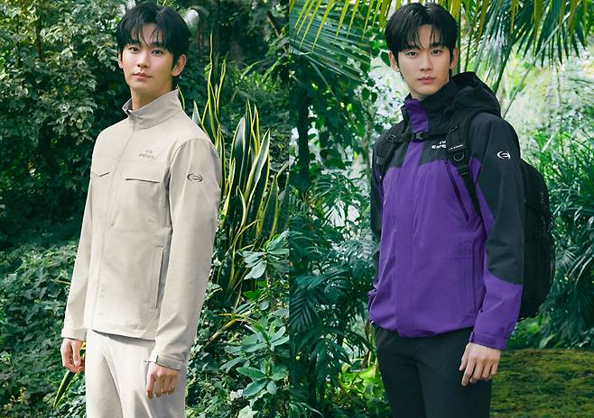 특히 김수현은 크림베이지 컬러의 ‘심플렉스 테크자켓’과 팬츠를 톤온톤으로 매치해 고급스럽고 편안한 아웃도어룩을 선보였습니다.