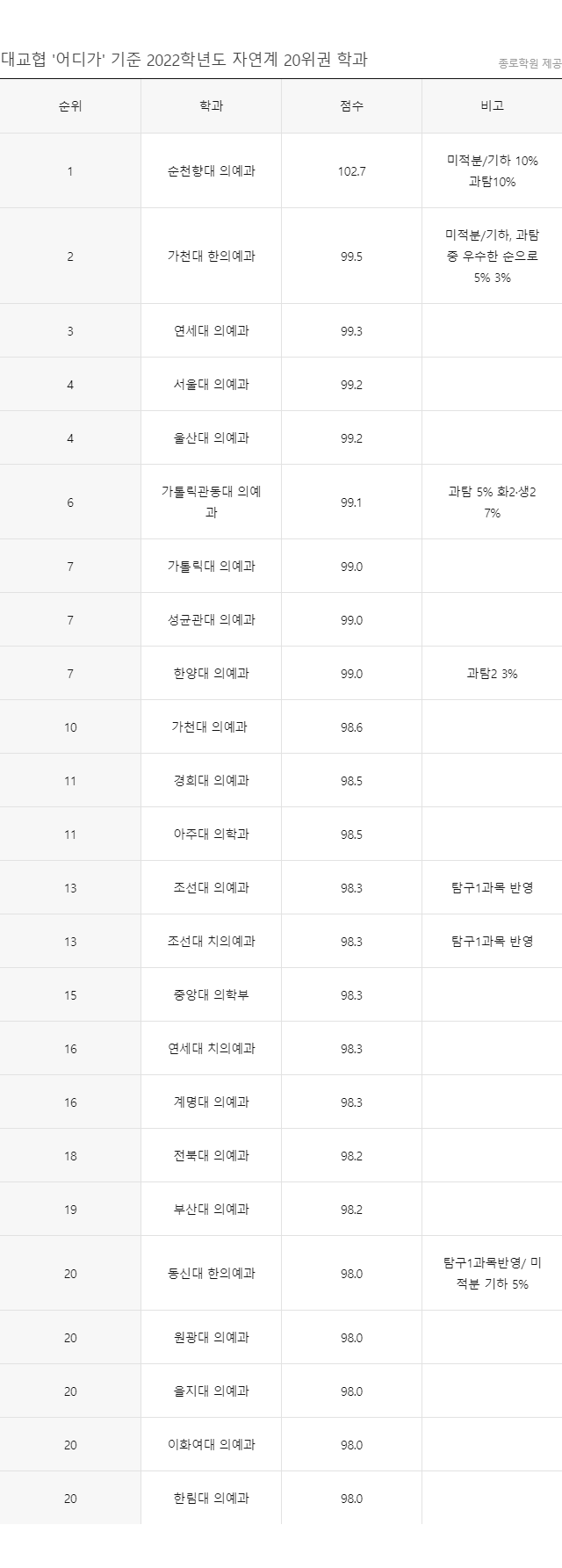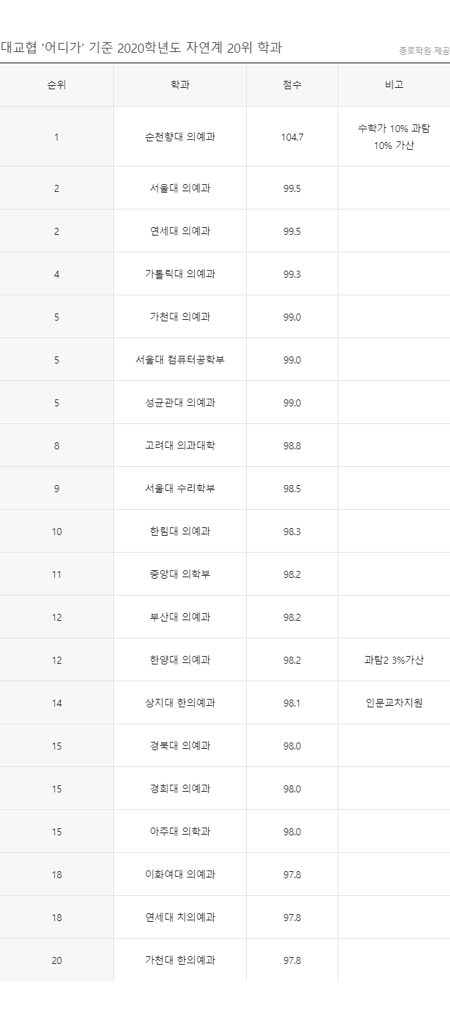 상위 20위권 내 학과 전부 '의대·치대·한의대'