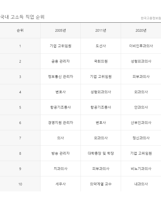 고용정보원이 올해 4월 발표한 '2020 한국 직업 정보 보고서'에 따르면, 소득 상위 10개 직업 중 기업 고위임원(8위)을 제외하고 나머지를 모두 의사가 차지했다. 이비인후과, 성형외과, 피부과, 외과, 안과, 산부인과, 정신과, 비뇨기과, 내과 순이다. 11~20위 사이 직업 중 항공기조종사(12위), 대학총장(14위), 금융관리자(17위)를 제외한 7개 직업이 의사, 한의사, 치과의사였다. 고소득으로 분류되는 변호사는 21위를 기록했다.