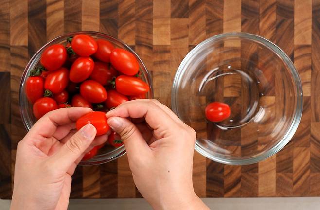 방울토마토를 사 오면 가장 먼저 해야 할 일은 꼭지를 모두 따는 것입니다. 그 후 베이킹소다나 식초를 푼 물에 잠시 담가 불순물을 제거하고 흐르는 물에 깨끗이 씻어냅니다. 여기서 가장 중요한 포인트는 '물기 제거'입니다. 세척 후 물기가 남아 있으면 아무리 꼭지를 뗐어도 곰팡이가 번식하기 쉽습니다. 키친타월을 이용해 물기를 완벽히 닦아내야 합니다.