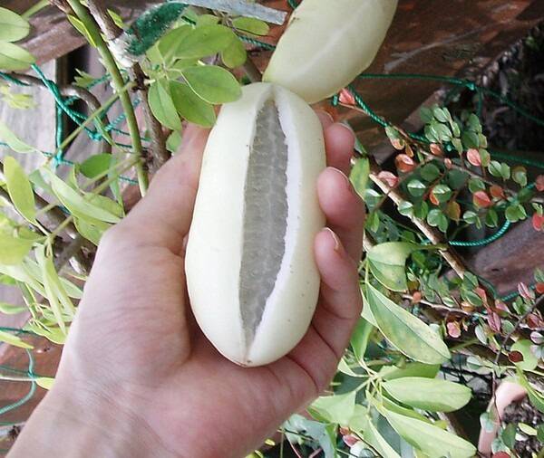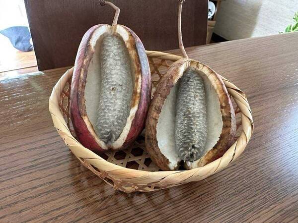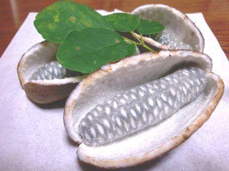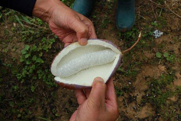 껍질이 벌어진 으름 열매의 하얀 과육을 바로 먹으면 바나나처럼 달콤한 맛을 느낄 수 있습니다.
