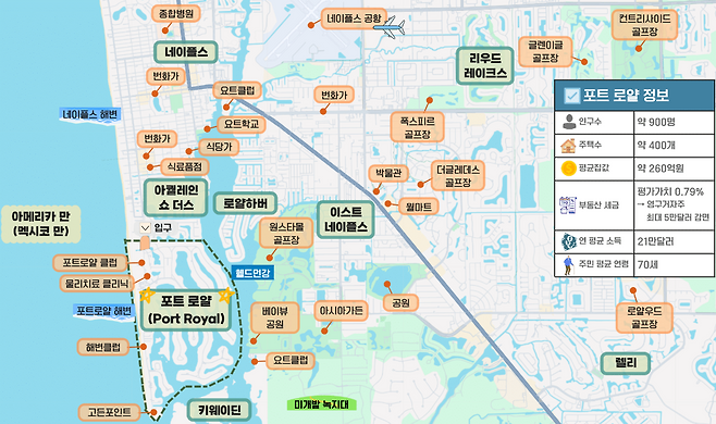 미국 플로리다 주는 현지에서 ‘신의 대기실(God’s Waiting Room)’로 불린다. ‘신의 대기실’이란 죽음을 앞두고 곧 신과 마주할 노인들이 많다는 의미와 죽기 전까지 신처럼 살 수 있다는 의미를 동시에 지니고 있다. 그 중에서도 ‘포트 로얄(Port Royal)’은 은퇴 후 플로리다를 찾는 부유층 중에서도 ‘상위 1%’가 선호하는 부촌으로 유명하다. 미국 현지에선 “신들의 대기실에 특실이 바로 포트로얄이다”는 평가가 나올 정도다.