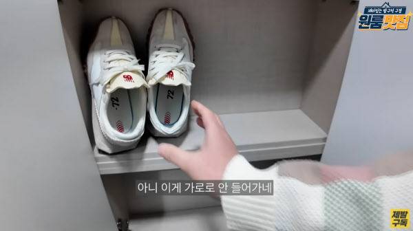 방 내부로 들어가자 가장 먼저 신발장이 보였는데, 신발장의 크기가 일반 신발장에 비해 터무니없이 작은 모습이 공개됐다. 통상 신발장에 신발을 세로 형태로 보관하지만 신발장 너비와 폭이 워낙 좁아 가로로 보관할 수 밖에 없는 구조다. 마치 신발 가게에서 신발을 가로로 진열한 모습을 연상케 하는 모습이다.