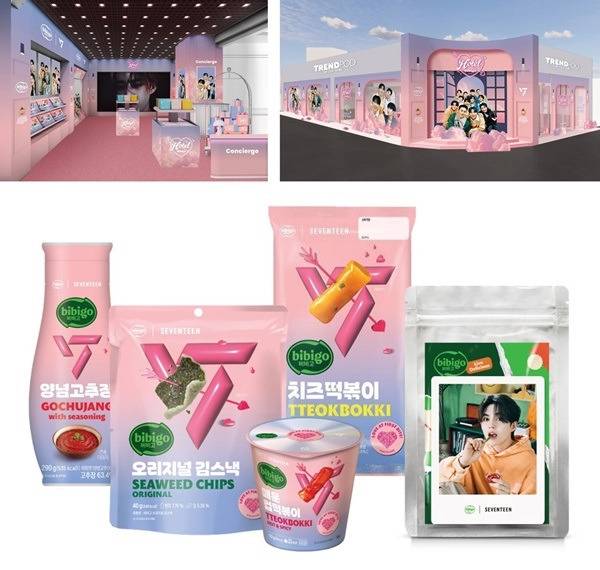 26일 CJ제일제당은 외국인 관광객이 많이 찾는 올리브영 명동역점과 홍대점에서 세븐틴의 팀 컬러와 로고를 적용한 비비고 김스낵과 컵떡볶이, 고추장, 쌈장을 판매한다고 밝혔다.