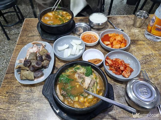 가게는 넓지 않았지만 테이블 간격이 좁지 않아 둘이 식사하기에도 불편함은 없었다. 벽면에 부착된 환풍기와 커다란 선풍기, 자리마다 구비된 조미료통까지 오래된 식당 특유의 질서가 느껴졌다. 계산대 앞에는 소주 박스가 쌓여 있었고, 안쪽 냉장고엔 머리고기와 곱창 볶음용 재료가 정리돼 있었다. 대충 흘려 만든 집은 아니었다.