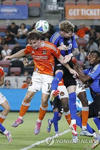 Houston Dynamo midfielder Sebastian Kowalczyk, left, and CF Montreal defender Dawid Bugaj, second from right, battle to head a corner kick during the second half of an MLS soccer match Saturday, June 14, 2025, in Houston. (AP Photo/Michael Wyke)