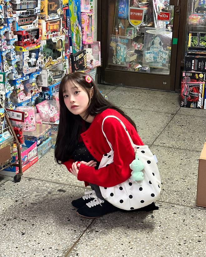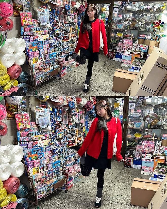 시선을 강렬하게 사로잡는 레드 가디건에 블랙 미니스커트를 매치해 컬러 대비를 확실히 주었고, 여기에 도트 패턴 타이즈와 회색 레그워머를 더해 90년대 감성을 현대적으로 재해석했죠.