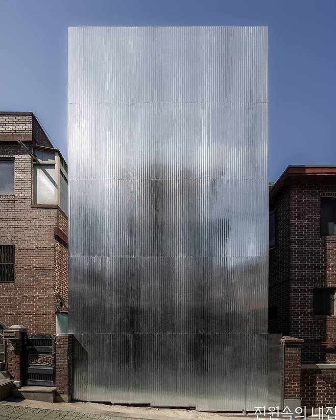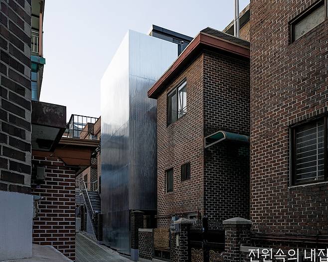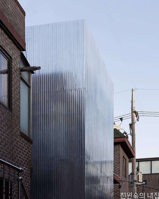 초기 주택은 건물의 인상을 가장 크게 좌우하는 얼굴이 되는 면, 즉 도로면 쪽에 외부 계단실이 위치해 건축물의 외관이 고르지 못하고 지저분했다. 주변 적벽돌 다가구 건물 중에서도 가장 정돈되지 못한 모습이었다. 특히 1~2층에 임대를 둘 계획이어서 건물의 인상이 주변 집에 비해 도드라져 보이는 것이 중요했다. 그래서 우선 주택의 인상을 심플하지만 강력하게 정돈하고자 했다. 외부 면을 간결하게 정리하는 것만으로도 충분히 임팩트가 있을 것으로 생각했고, 다양한 소재를 고민했지만, 예산상의 이유로 저렴한 소재인 경량 철골을 선택하게 되었다. 저렴할 뿐만 아니라 주변 건물과 소재적 대비를 이루어 낼 수 있는 마감이었다.