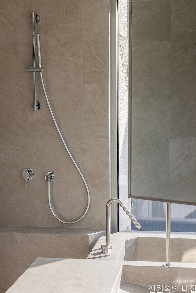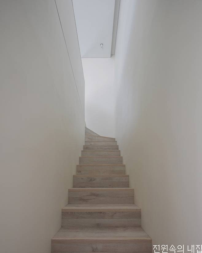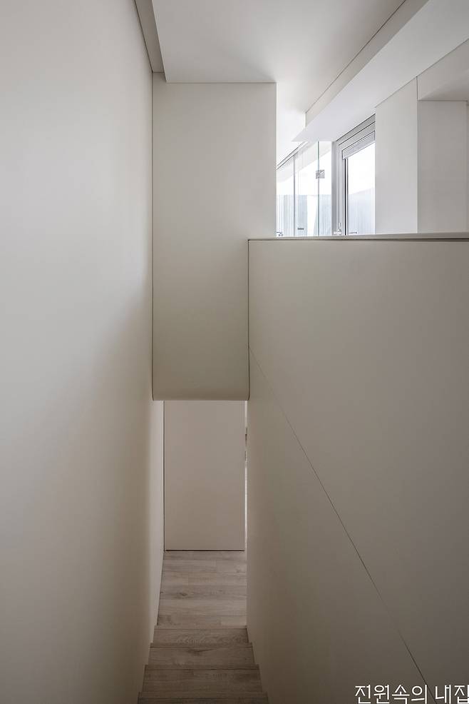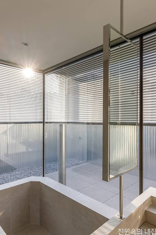 내부에서의 가장 큰 포인트는 4층 테라스와 바깥과의 연계였다. 좁고 높은 건물의 가장 상부층에서 하늘로 열리는 공간의 환기가 이 집의 가장 큰 매력이었다. 주변 건물들 높이가 비슷해 4층 테라스에서마저도 풍경이 좋지는 않았지만, 외부 건물을 감싸는 소재를 테라스 난간까지 확장하고 연장해, 주변 건물을 가리면서도 하늘을 볼 수 있게 했다. 4층 테라스에는 욕실도 배치했다. 하늘로 완전히 열린 욕실에서의 샤워 경험은 일상의 환기를 만들어낸다. 이로써 좁은 골목 다세대 주택단지 안의 평범했던 주택이 화려하지는 않지만, 적절한 무게감과 임팩트를 가진 독보적인 개성의 주택으로 탈바꿈하였다.