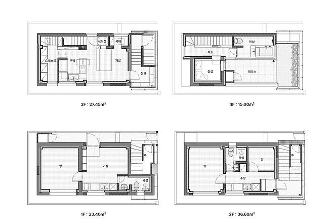 한편, 건축주가 이 건물을 고르게 된 가장 큰 이유는 4층이었다. 외부 테라스를 확보할 수 있으면서도 테라스에서 보이는 하늘이 가장 큰 선택 요인이었다. 건축주 부부가 두 개 층(3, 4층)을 모두 사용해도 그리 넉넉한 평수는 아니었지만, 작은 면적의 공간이 이들에게 큰 단점은 아니었다. 집을 고치면서 1~2층을 각각 임대 놓을 수 있게 할 것, 3층과 4층을 건축주 부부가 직접 사용하되, 작은 면적의 답답함이 4층의 테라스에서 완벽하게 환기될 수 있게 하는 것이 주요한 포인트였다.