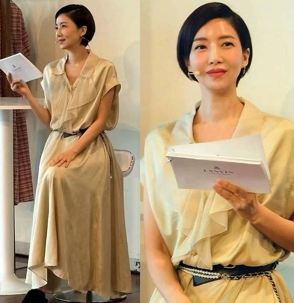베이지 컬러의 드레이프 롱 드레스를 착용해 차분하고 우아한 무드를 연출했습니다.