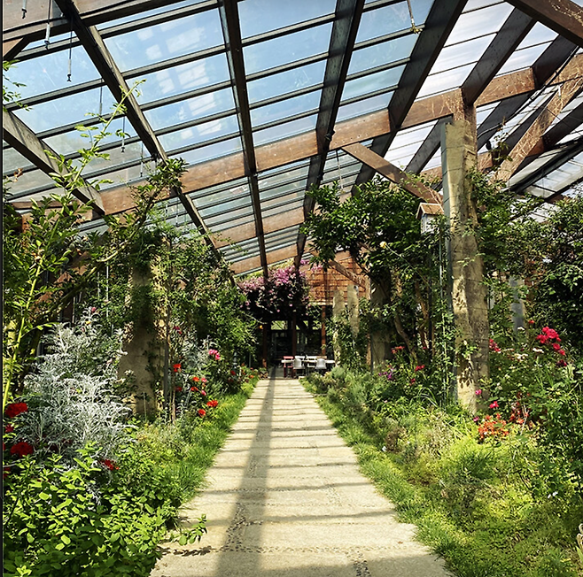 온실 옆 글라스하우스 테라스에서 로즈마리, 세이지 향 맡으며 여유로운 식사를 즐길 수 있어요.직접 재배한 허브를 사용한 요리라서, 입안 가득 퍼지는 향이 정말 특별하답니다!