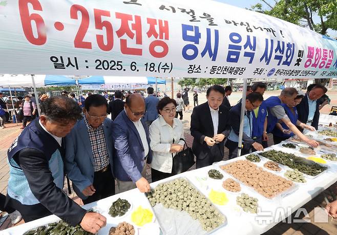 [인천=뉴시스] 전진환 기자 = 18일 인천 동구 동인천북광장에서 열린 6.25 전쟁음식 체험 행사에서 시민들이 보리주먹밥, 쑥버무리 등을 맛보고 있다. 2025.06.18. amin2@newsis.com