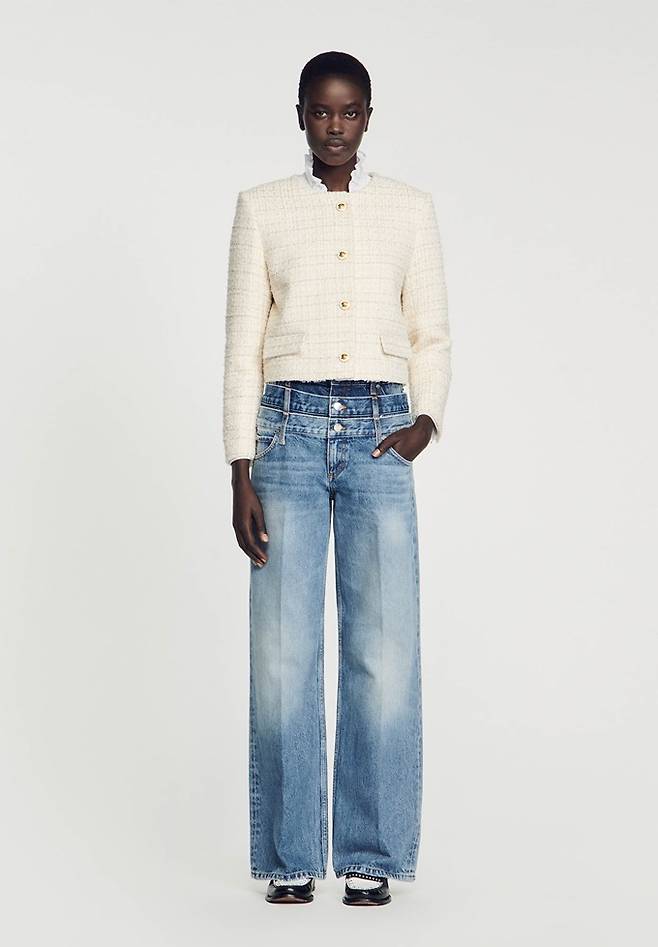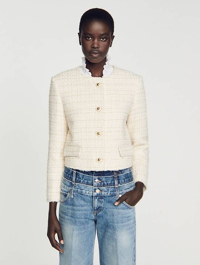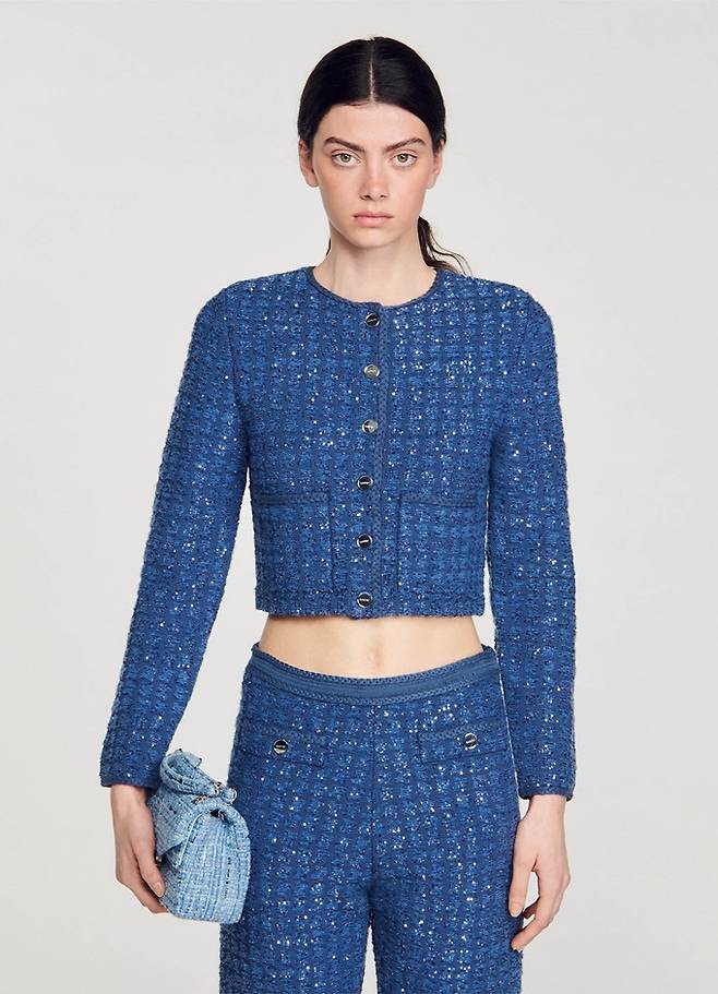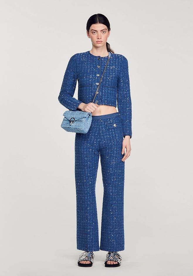 프렌치 컨템포러리 '산드로' 스팽글 트위드 카디건 및 트위드 재킷으로 연출한 파워우먼룩