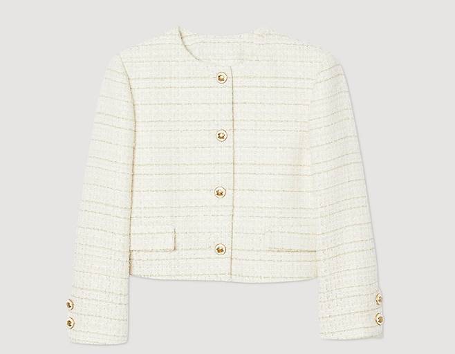 라운드넥 트위드 재킷 역시 프렌치 컨템포러리 브랜드 '산드로' 제품으로 화려한 버튼 여밈과 슬릿이 있는 커프스로 포인트를 주었다.