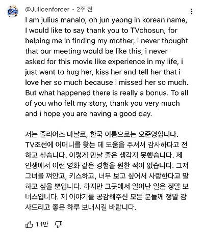 약 1년 전 '엄마의 봄날'에 특별한 사연이 들어왔다. 바다를 건너에 있는 머나먼 나라에서 아들이 보내온 잃어버린 엄마를 찾아달라는 간절한 사연이었다. 신청자는 필리핀에 거주하는 줄리어스 오 마나(38세, 한국 이름: 오준영)로, 잃어버린 엄마의 이름은 오금님(59세)이었다.