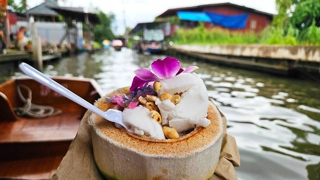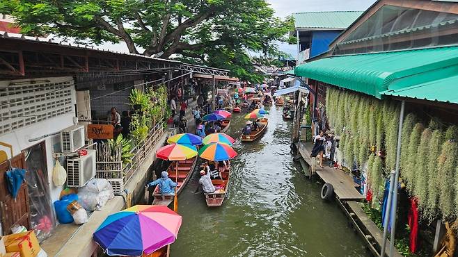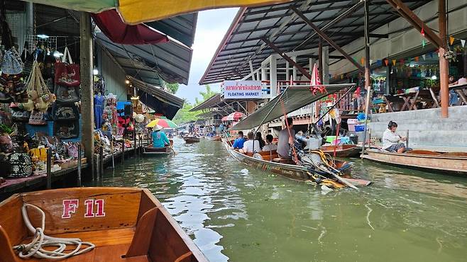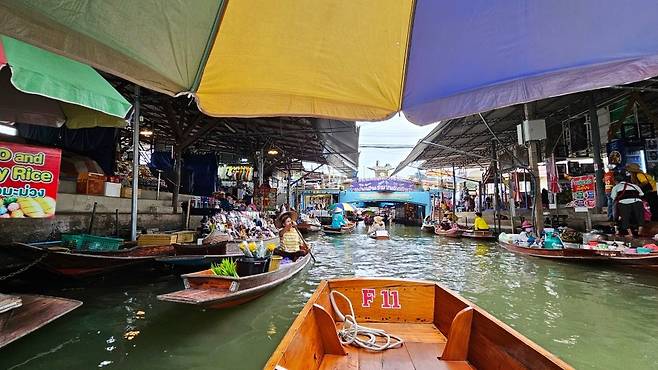 방콕 3일 차 아침 일찍 조식을 먹고 미리 예약한 담넌싸두억 수상시장과 매끌렁 기찻길시장 반일 투어 출발 장소로 향했습니다. BTS National Stadium역에 있는 쇼핑몰인 MBK Center 옆 골목에서 모인 후 투어 승합차를 타고 담넌싸두억 수상시장으로 이동했습니다. 담넌싸두억 수상시장은 방콕과 조금 떨어져 있어 투어 신청해서 다녀오는 게 편합니다. 담넌싸두억 수상시장은 배를 타고 돌아보는데요, 승선비는 일 인당 150밧입니다. 배를 타고 시장을 한 바퀴 둘러본 후 약간의 자유시간 동안 시장을 둘러볼 수 있습니다.