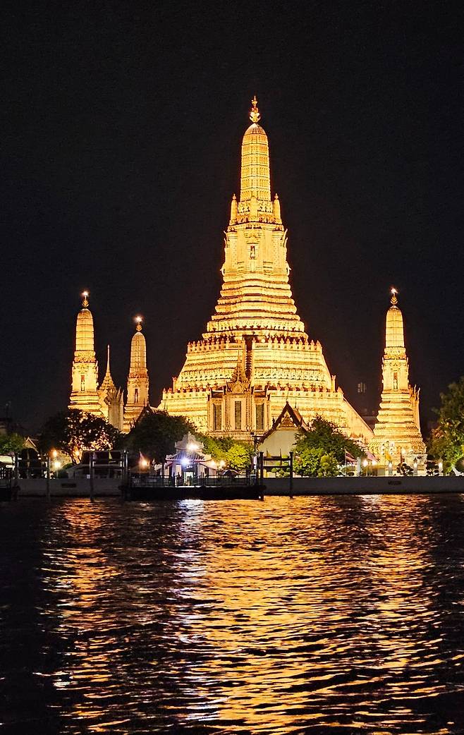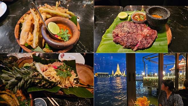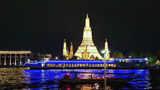 마사지까지 받고 호텔로 돌아와 잠깐 휴식을 취한 다음 저녁을 위해 롱롯이라는 식당으로 이동했습니다. 이곳은 왓 아룬 야경을 보며 식사를 할 수 있는 곳으로, 창가 자리는 몇 달 전부터 예약이 끝나 실내 적당한 자리로 예약했습니다. 짜오프라야강과 왓 아룬의 야경을 보며 식사하는 호사를 누려봅니다. 다음에 오게 된다면 짜오프라야강을 오가며 저녁 식사를 할 수 있는 디너 크루즈도 해보고 싶습니다.
