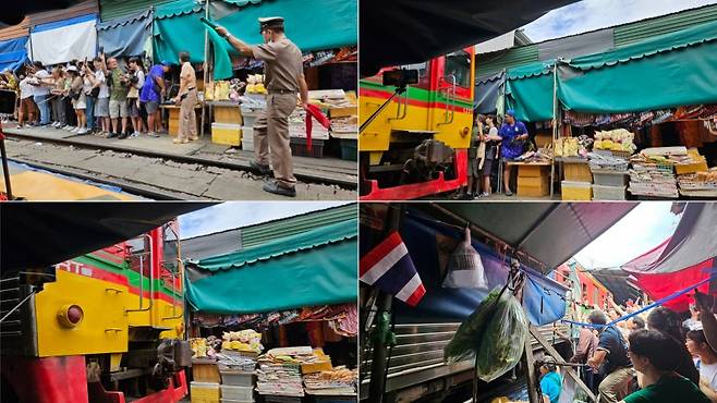 다음 코스는 매끌렁 기찻길 시장입니다. 기찻길을 따라 펼쳐진 시장을 구경하고 기차가 들어오는 광경을 볼 수 있습니다. 기차가 들어오면 역무원이 관광객을 통제하고 상인들은 일사불란하게 좌판을 정리합니다. 기차를 타고 오는 사람과 구경하는 사람들이 손을 흔들며 사진찍기 바쁩니다.