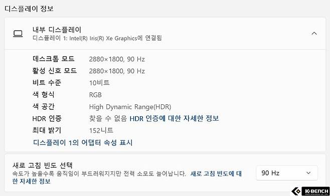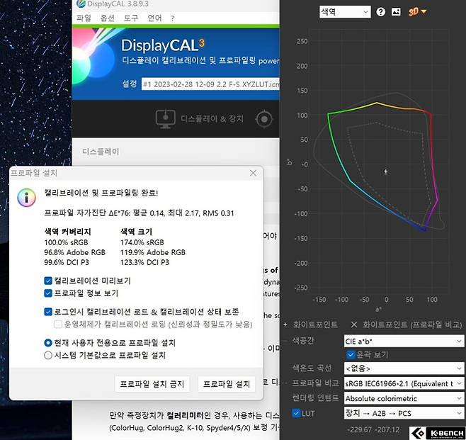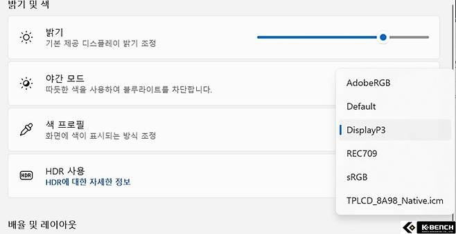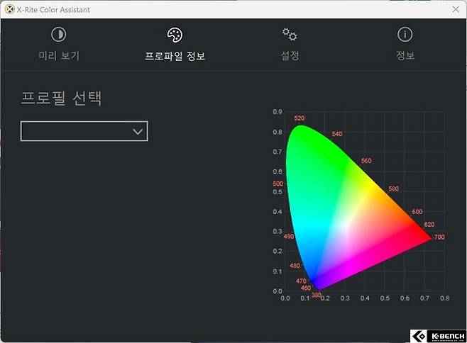 실제로, 케이벤치에서 디스플레이를 측정할때 사용하는 X-Rite i1 측정기를 통해 디스플레의 색 정확도나 수치등을 측정해보았다. 참고로 이 수치는 테스트 장비와 주변 환경에 따라 일부 오차가 있을 수 있다는 점을 미리 언급한다.