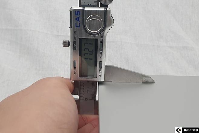 제품 두께도 제어보았는데, 비교적 두꺼운 부분으로 보여지는 힌지와 가까운 부분을 제었을때, 17.27mm 수준이였다.