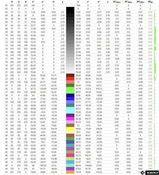 다만 회색 부분만 아주 아쉽게 조금 벗어나는 모습을 볼 수 있는데 이조차도 사실 다른 디스플레이에 비하면 높은 수준이기 때문에 전쳊거인 컬러나 블랙의 색 정확도가 상당한 디스플레이라는 점을 다시한번 강조할 수 있는 부분이다.