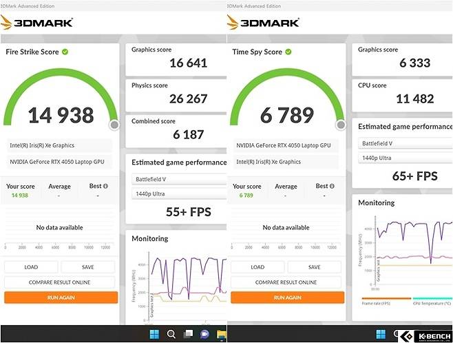 GPU는 3DMark의 FireStrike 및 TimeSPY를 구동해보았는데, 확실히 어느정도 제한적인 GPU인만큼 데스크탑 보다는 아쉽지만, 그래도 폼팩터 기준으로는 준수한 결과값을 볼 수 있었다.