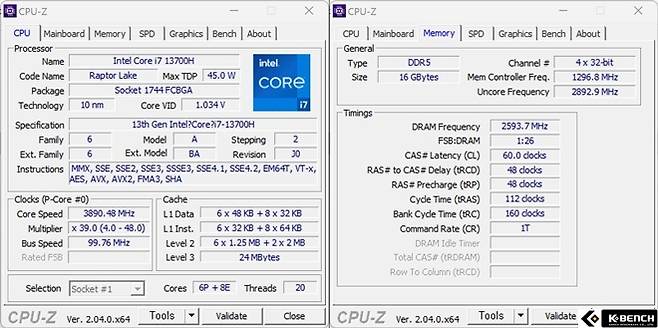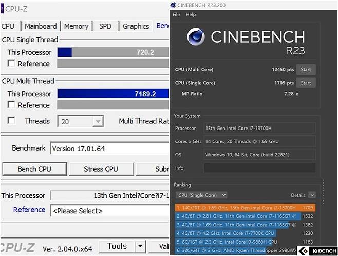 CPU 벤치마크는 CPU-Z 및 CinebenchR23을 구동해 보았으며, 최신 CPU에 걸맞는 뛰어난 점수가 결과값으로 나온 모습이다.
