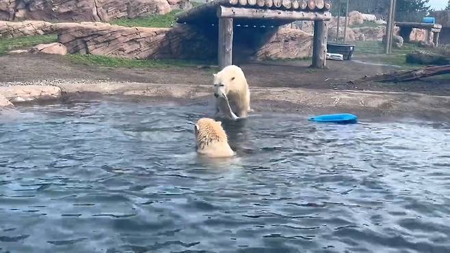 물 속에서 벌어진 북극곰들의 줄다리기는 처음 보는 것 같은데요.