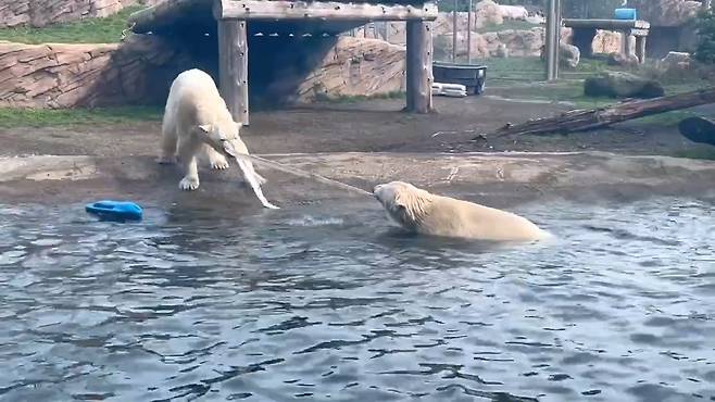 북극곰이 줄을 문채 다른 북극곰에게 달려들자 이 녀석도 줄을 물고 놔주지 않습니다.