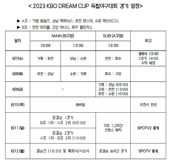 모든 경기는 횡성 KBO 야구센터에서 진행되고, 예선전은 7일부터 9일까지 사흘간 펼쳐지며, 준결승전과 대망의 결승전은 6월 11일과 12일에 열린다.