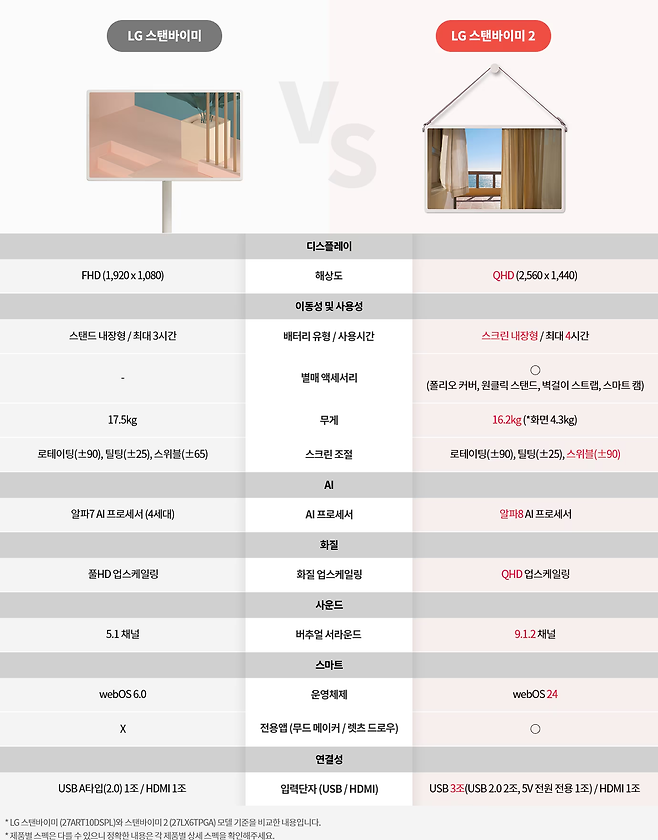 LG 스탠바이미2는 기존 TV와 달리 완전 무선, 터치 조작, 이동성을 강점으로 내세운 제품이다. 반면, 삼성 스마트 모니터(M8 등) + 이동형 스탠드(별도 구매) 조합, 일명 '삼텐바이미'는 스탠바이미보다 저렴한 가격에 고해상도를 제공하면서도 이동성을 갖춘 대안으로 떠올랐다.