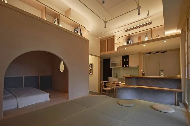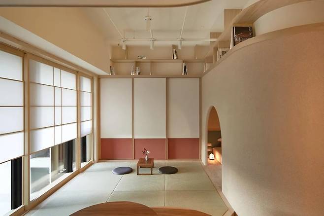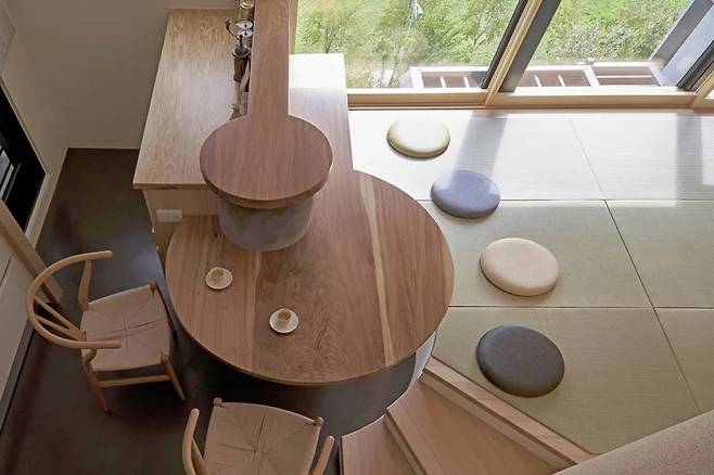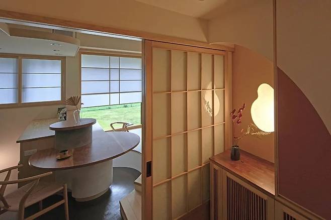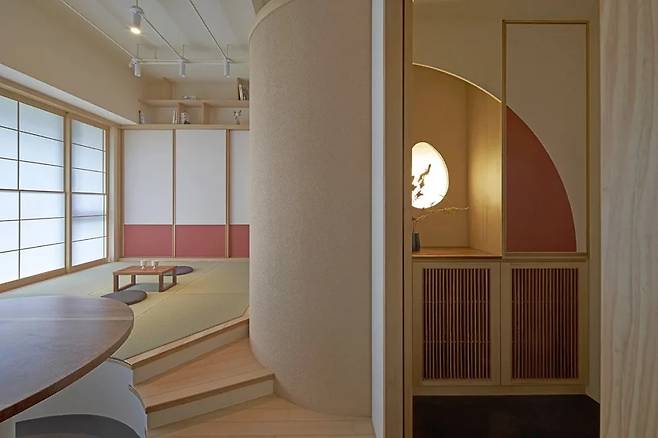 현관에서 이어지는 곡선 벽을 따라 올라가면 식사 공간이 드러납니다. 이곳의 중심에는 일본에서 직수입한 요시노 삼나무로 제작된 원형 다다미 테이블이 있습니다. 자연광이 쏟아지는 가운데 나무의 결이 돋보이고, 수작업으로 만들어진 맞춤 가구들이 공간에 완벽한 곡선미를 더합니다.