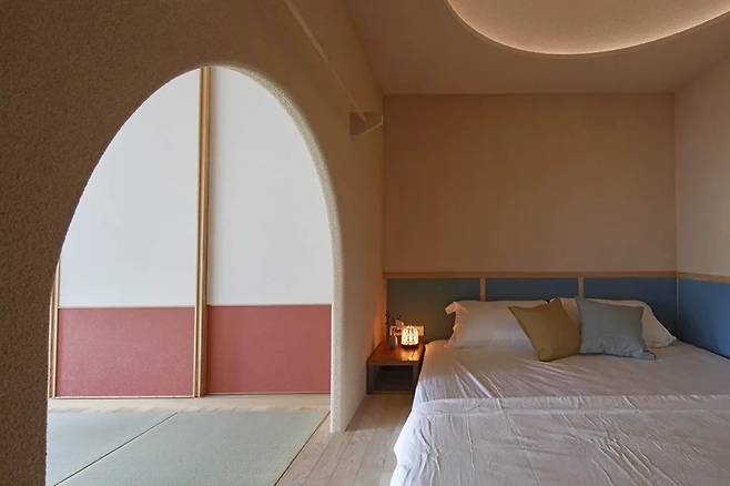 눈에 띄는 점은 내부 벽에 설치된 L자형 섬유 보드와 푸른색 벽입니다. 이는 침대의 독립성을 강조하며, 머무는 이에게 더욱 안락한 느낌을 제공합니다. 침대 끝에는 손님을 위한 공간을 남겨두는 일본 전통 예법도 실천되어 있습니다. 이러한 세심한 디테일이 공간의 깊이와 정체성을 형성합니다.