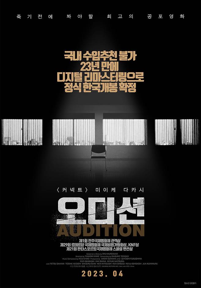 제1회 전주국제영화제에서 최고 인기상인 관객상을 수상하며 유독 국내 관객들에게 더 큰 사랑을 받아온 <오디션>은 이처럼 한국과는 특별히 깊은 인연과 끊임없는 관객 입소문과 관심 덕에 마침내 전격 소환, 오는 4월 전국 극장에서 만날 수 있다.