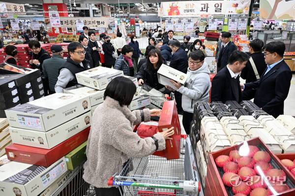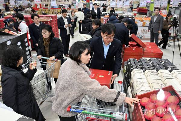10일 오전 농협수원유통센터에서 열린 ‘2026년 설맞이 경기도 우수 농·특산물 특판전’에서 많은 시민들이 과일 등 타임 세일 품목을 구매하고 있다.