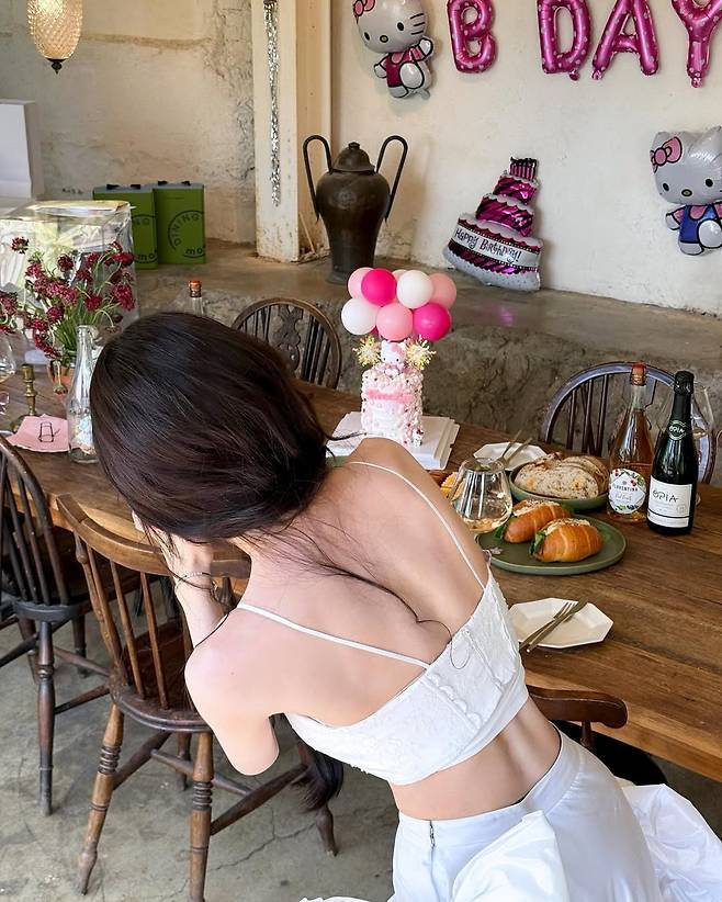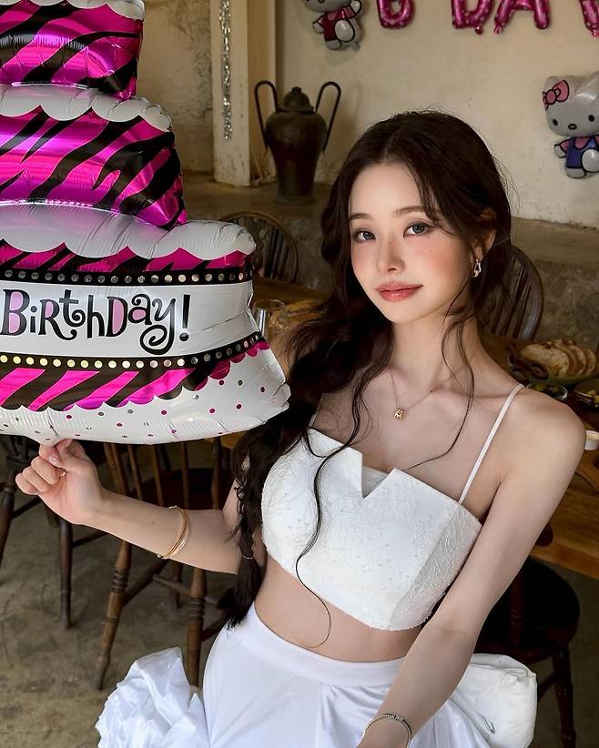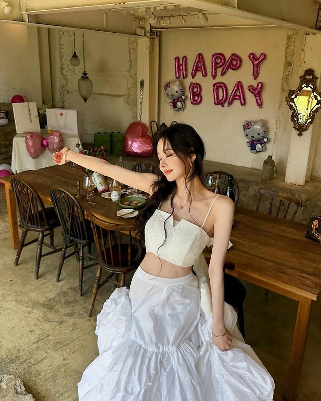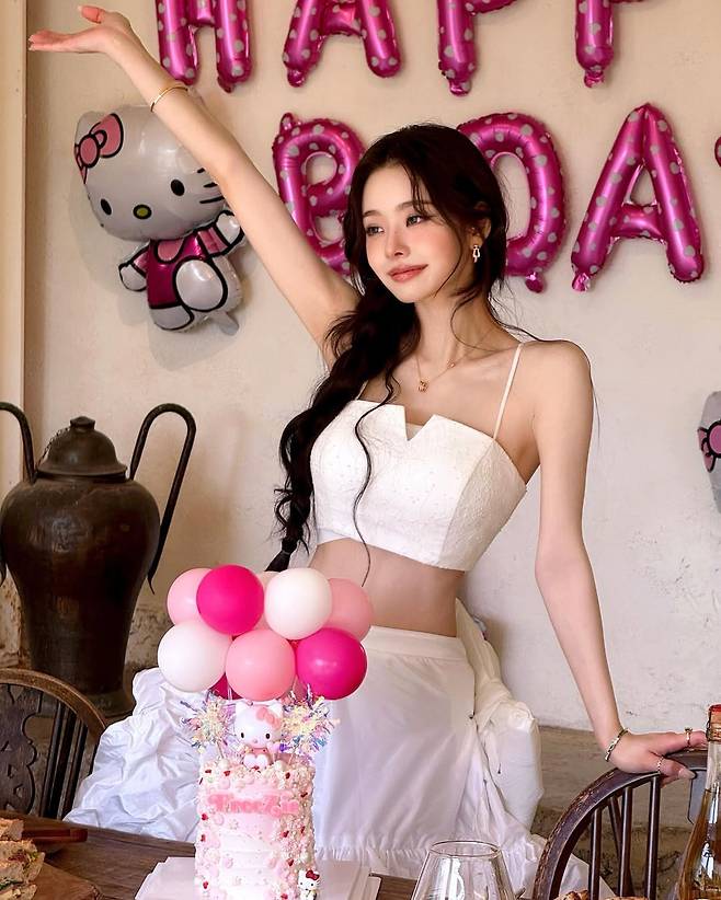 프리지아는 이날 화이트 톤의 브라탑과 플레어 스커트를 매치해 청순하면서도 우아한 생일룩을 연출했다.