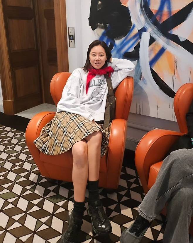 공개한 사진에서 공효진은 단발 헤어 스타일에 버버리 체크 플리츠 스커트와 그레이 스웻셔츠를 착용한 캐주얼한 스타일로 대학생 여친 같은 여행룩을 선보였다.