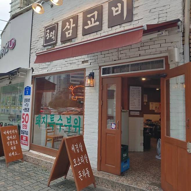 공덕역 근처에 위치한 공덕 삼교비. 이곳에서도 모소리살을 맛볼 수 있다. 이곳의 특징은 다양한 소스를 곁들여 먹을 수 있다는 것. 기본으로 5종의 소스를 내주니 취향에 맞게 골라 찍어 먹으면 된다. 특히 쌈장에 참기름을 섞어 먹는 소스는 어떤 고기와도 잘 어울리는데 특히나 고소하고 담백한 모소리살과 조합이 좋다. 쌈에 싸 먹는 것도 좋지만 모소리살 그대로의 식감을 꼭 느껴보는 것을 추천. 쫄깃쫄깃하면서도 지방이 많아 돼지 목덜미 살의 진가를 발견할 수 있다. 후식으로는 된장밥을 시켜보자. 고기를 굽던 철판에 된장찌개와 순두부를 넣고 끓여주는데 구수한 국물이 입가심으로 딱이다.