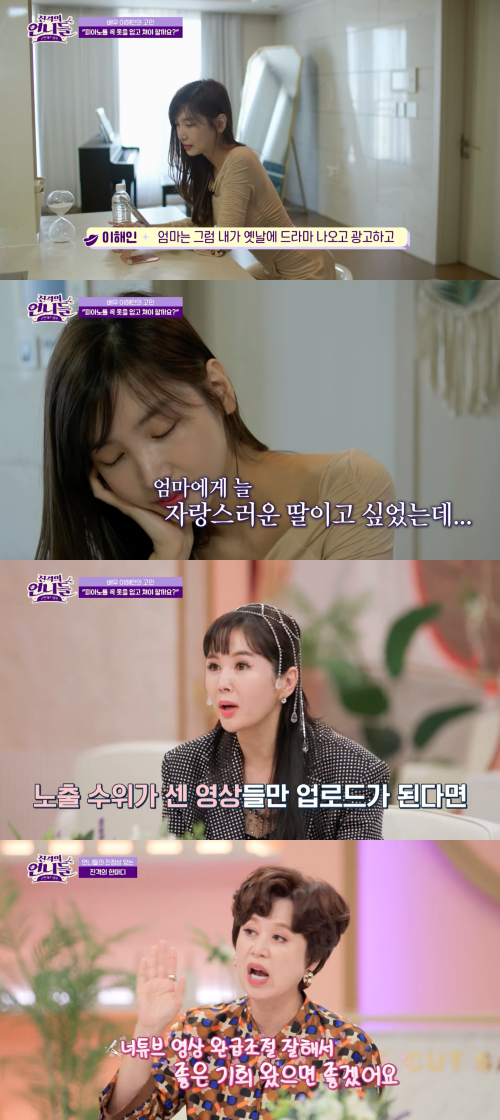 영상 속 이해인의 엄마는 "이모가 보지 말라더라. (그런 영상을) 좋아할 부모가 어딨냐. 배우할 때는 자랑스러웠다. 배우할 때는 가만히 있어도 사람들이 다가왔다. '무슨 꿈을 꾸고 그런 딸을 낳았습니까'하는 사람도 있었다"고 말했다.