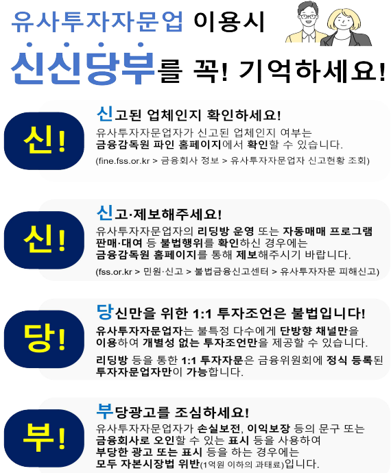 제도권 금융회사는 절대로 단체 채팅방·이메일 등을 통해 홈트레이딩서비스(HTS)나 MTS 같은 주식거래 프로그램 설치를 유도하지 않는다. SNS 등에서 금융회사 임직원으로 주장하는 자가 투자를 권유하면 해당 금융회사 고객센터에 연락해 현재 재직 여부를 확인해야 한다. 명함 전화번호 역시 가짜 번호일 수 있으므로 직접 회사 대표 번호를 검색해 연락해야 한다.